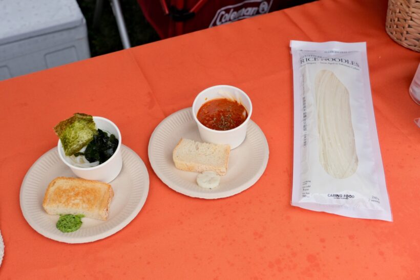 会場では、スノーピークが10月31日に販売する「新潟県産 米粉麺 雪室貯蔵」の試食会も実施。これは同社とエイベックス・ヘルスケアエンパワー合同会社が、東京・元麻布のレストラン「EPICURE」オーナーシェフの藤春幸治氏と共同開発した米粉麺で、28品目のアレルゲンとグルテンを含まない点や、雪室熟成をしている点が大きな特徴。試食会には藤春氏も来場し、同じくアレルギーに対応した2種のパスタソースで同商品を調理して提供した。