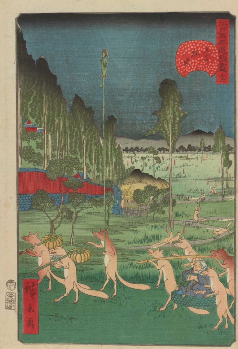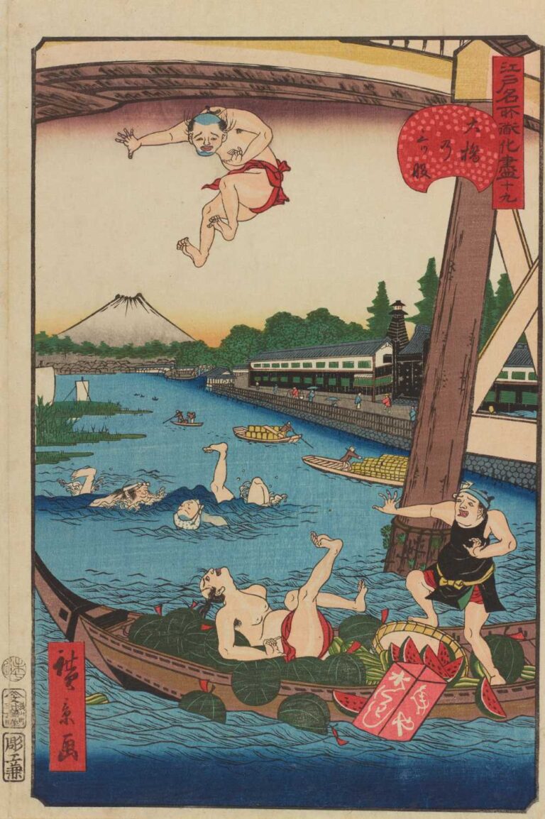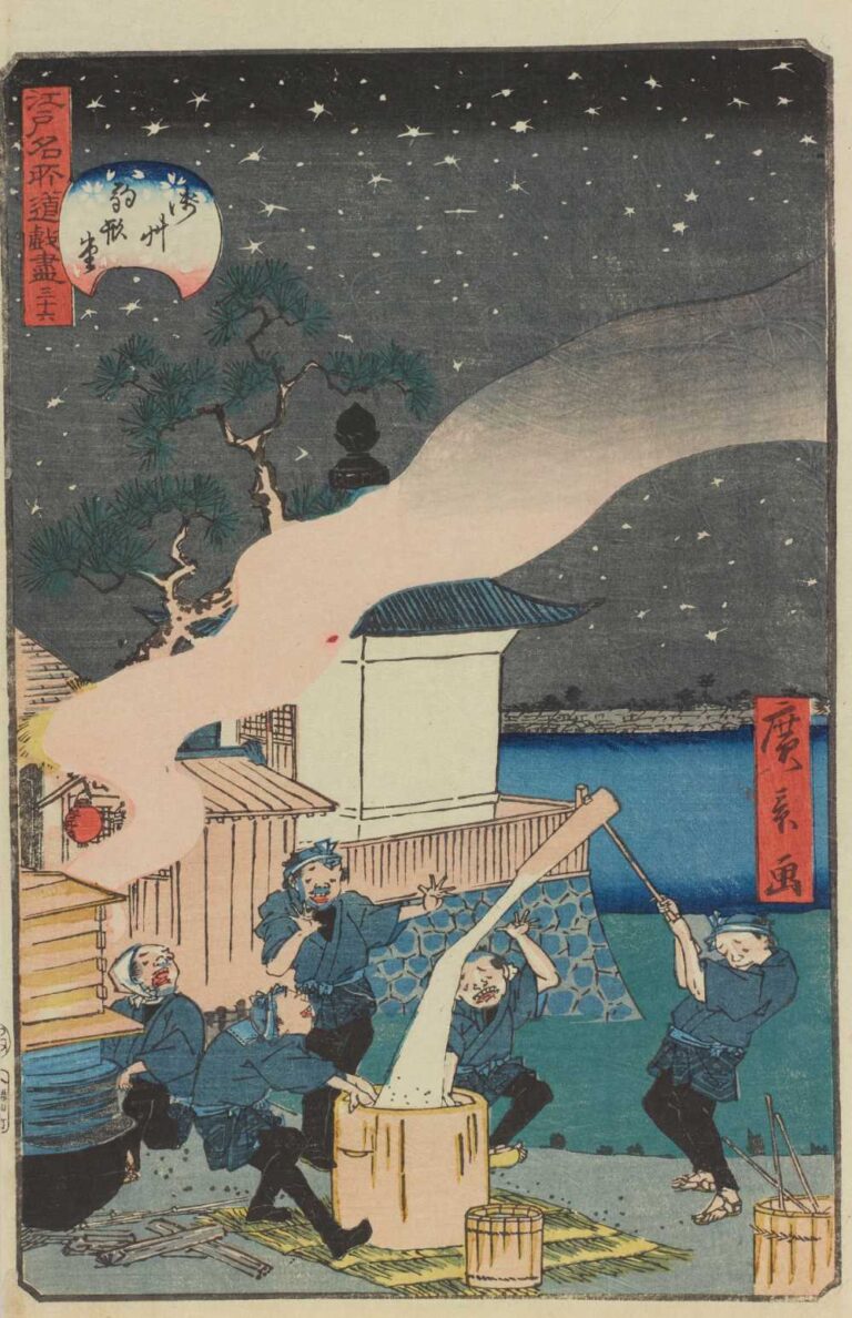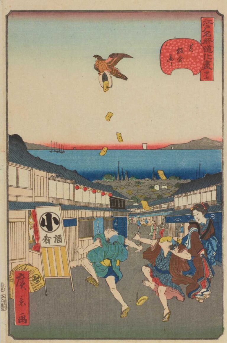 歌川広重の「名所江戸百景」が制作されたのは、1856年2月から1858年の10月、数え60〜62歳の頃でした。しかし1858年9月に病気で世を去った広重は、全点の刊行を見ることはなかったと言われています。一方、広景の「江戸名所道戯尽」が刊行されたのは、広重の最後の刊行が終わってから僅か3ヶ月後。よって広景が広重の作品を意識していたことは十分に考えられます。