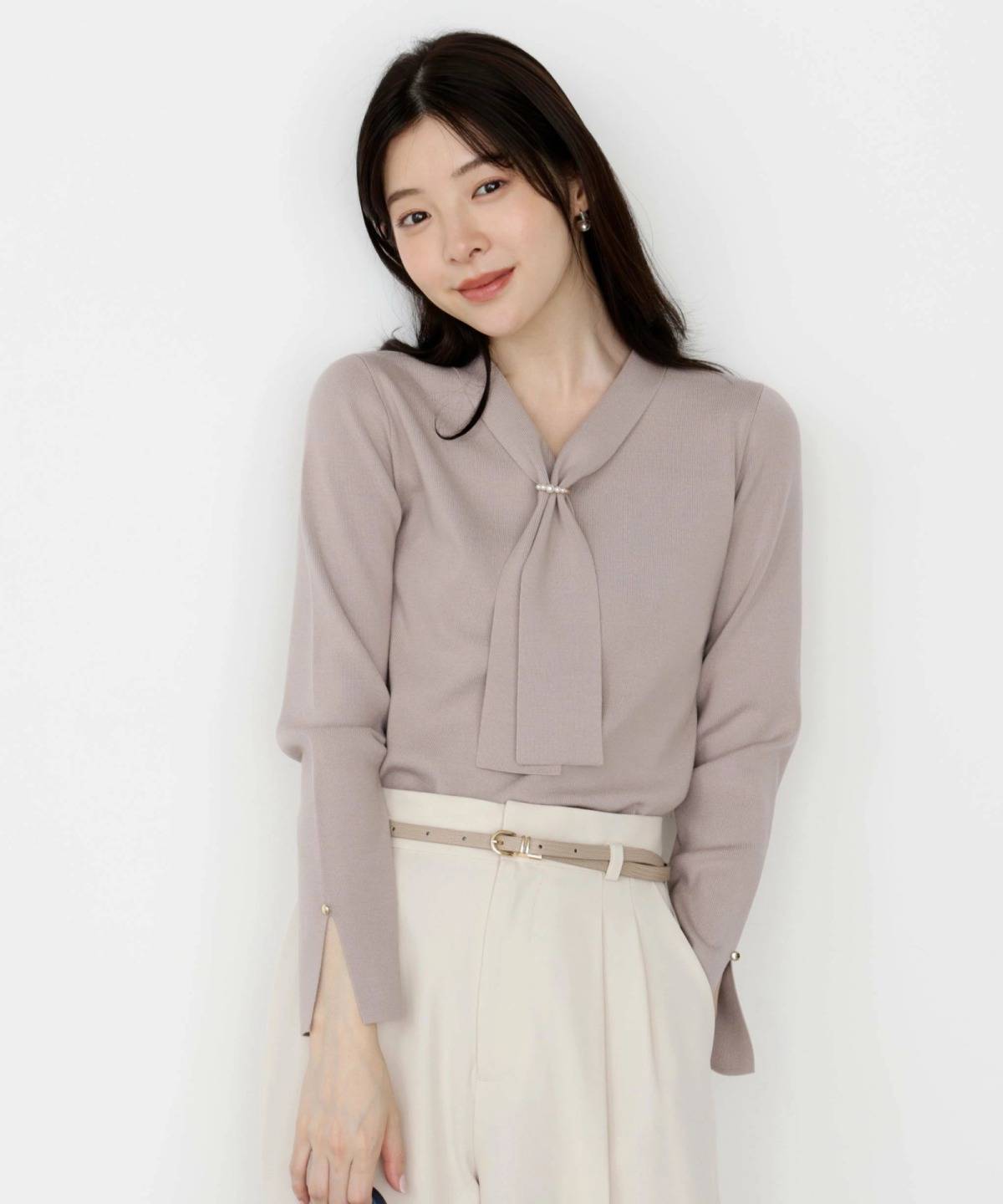 ボウタイデザインのニットトップスは、きちんと感があるため、大人女子に◎