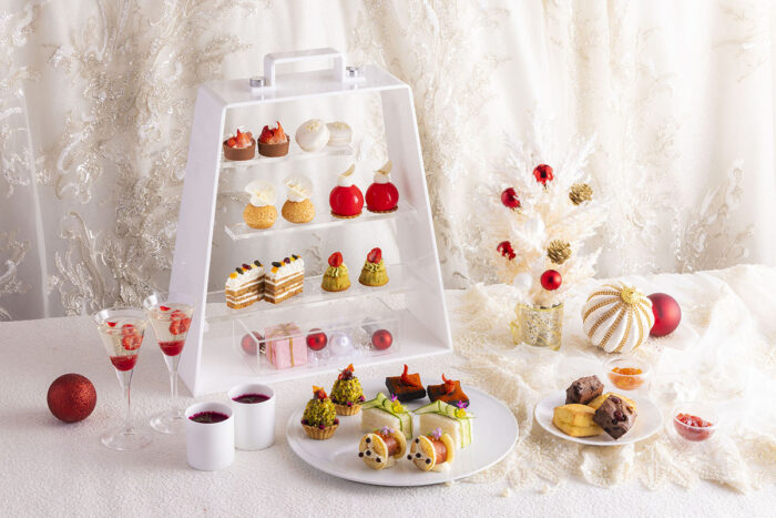 今年のテーマは「白銀の世界で楽しむ優雅なアフタヌーンティー」。ヒルトン広島のエグゼクティブペストリーシェフ・鷲見真奈美氏が手掛けるスイーツは、赤・緑・白のクリスマスカラーを取り入れ、まるでオーナメントのように煌めく全9種類。