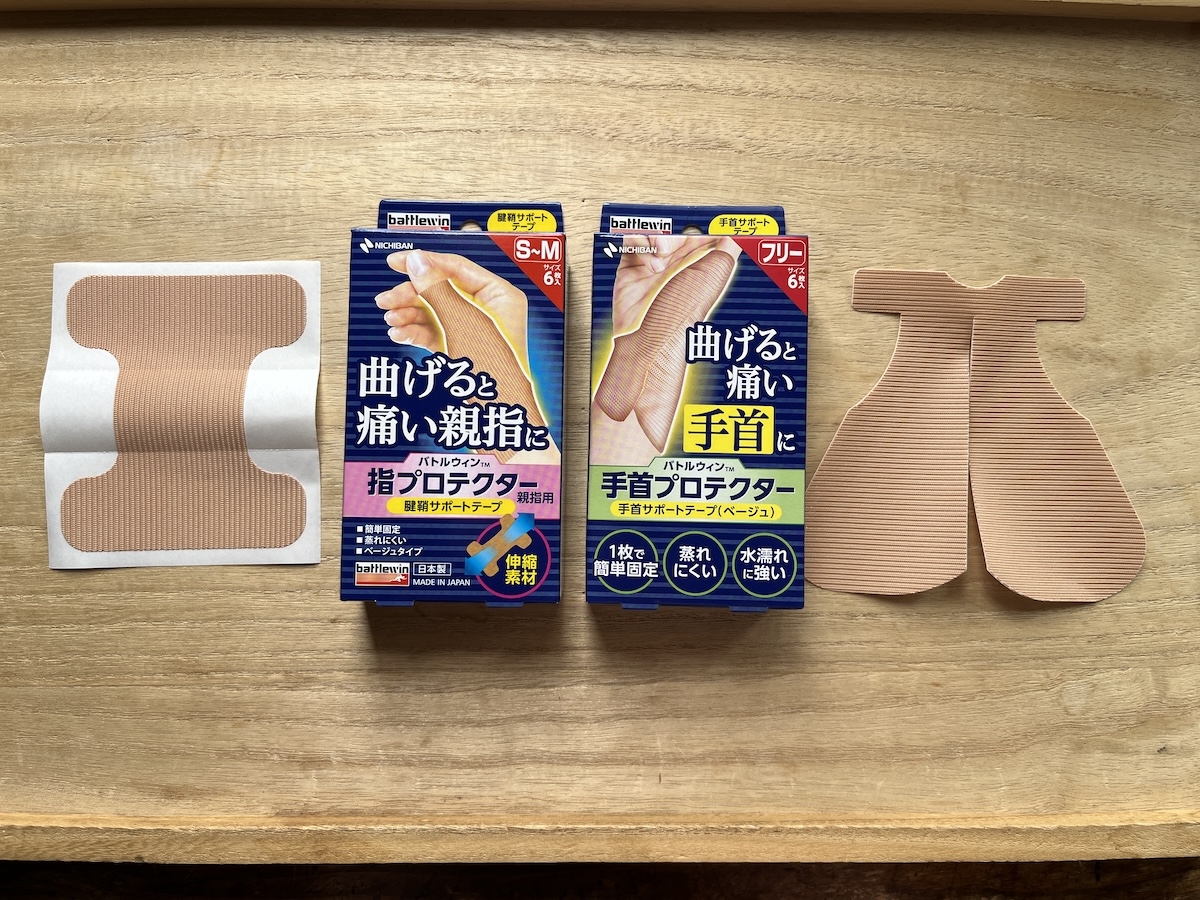 テーピングは1人でできないと思われがちですが、例えばニチバンからは、1人でも貼れる「バトルウィン 指プロテクター 親指用」や「バトルウィン 手首プロテクター」が販売されています。