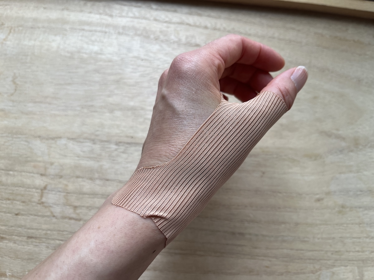 また手首や指を曲げたときに痛みが出ている場合は、テーピングで固定するのも効果的。そうすることで可動域が制限されますし、手首や指のサポートにもつながります。