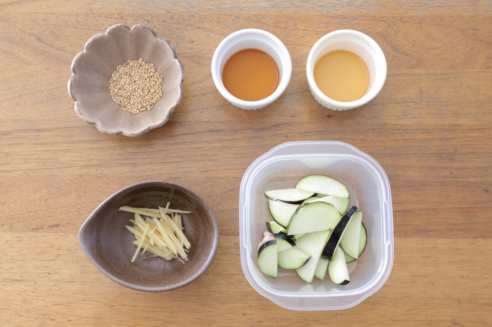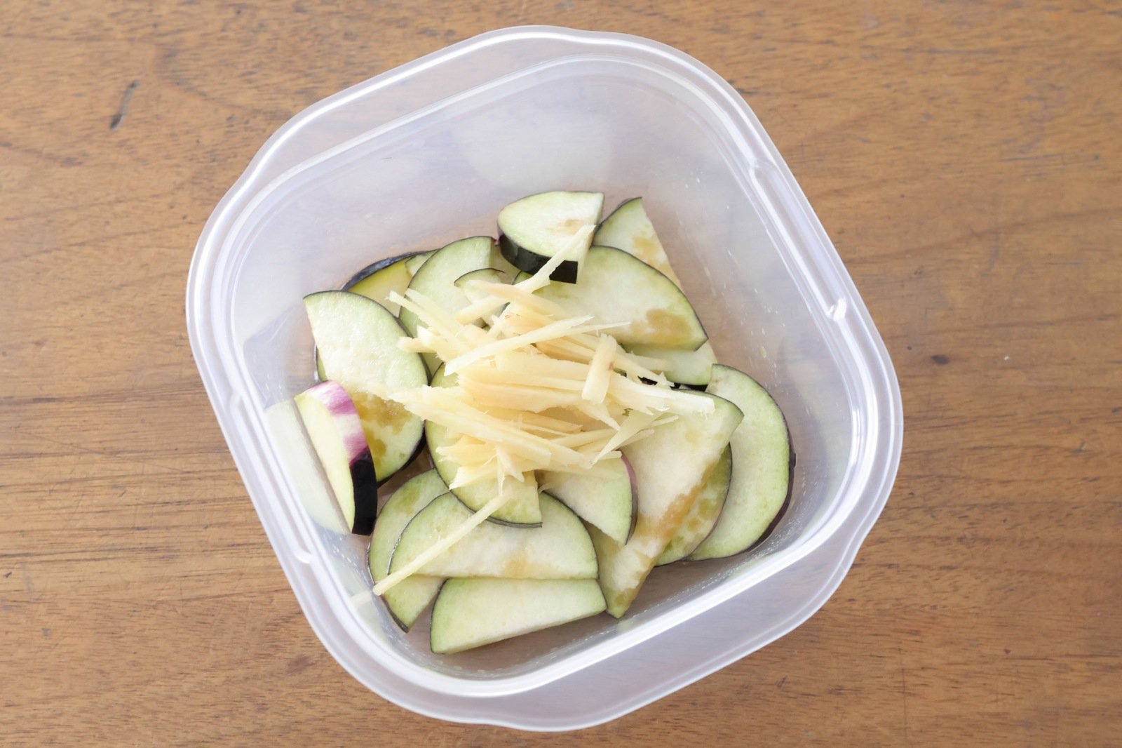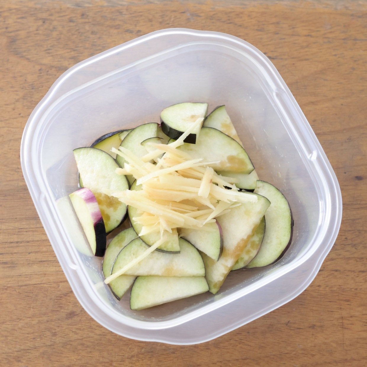 1.耐熱容器になすを入れ、ごま油をよく絡ませます。続いてしょうがとめんつゆも入れ、ラップを被せて、500Wの電子レンジで約1分(600Wでも同様)加熱します。