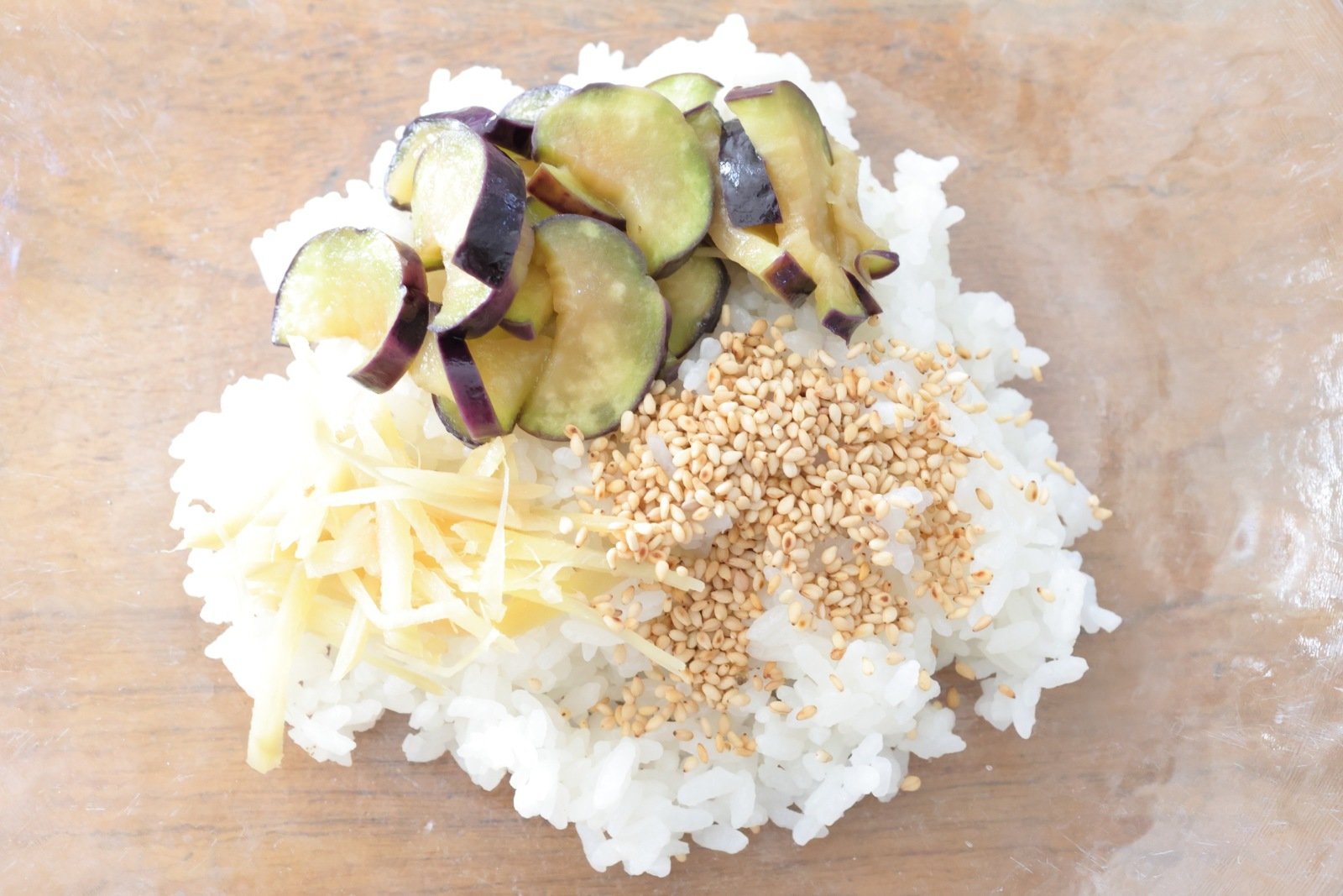 2.ごはんに、なす、しょうが、白ごまを混ぜ合わせます。