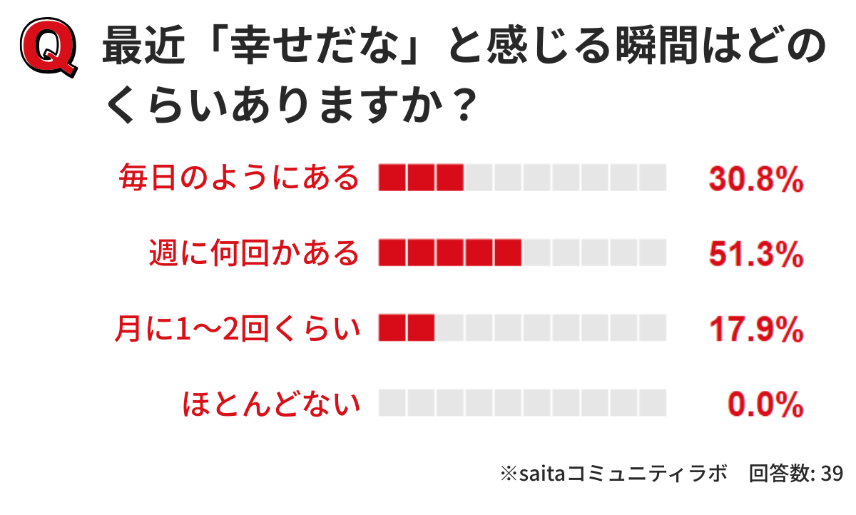 また、「幸せを感じる瞬間」についてもお聞きしたところ、半数以上の人が「週に何日かある」と回答しています。特別な出来事がなくても、日常の中で小さな喜びを見つけている人が多い結果となりました。