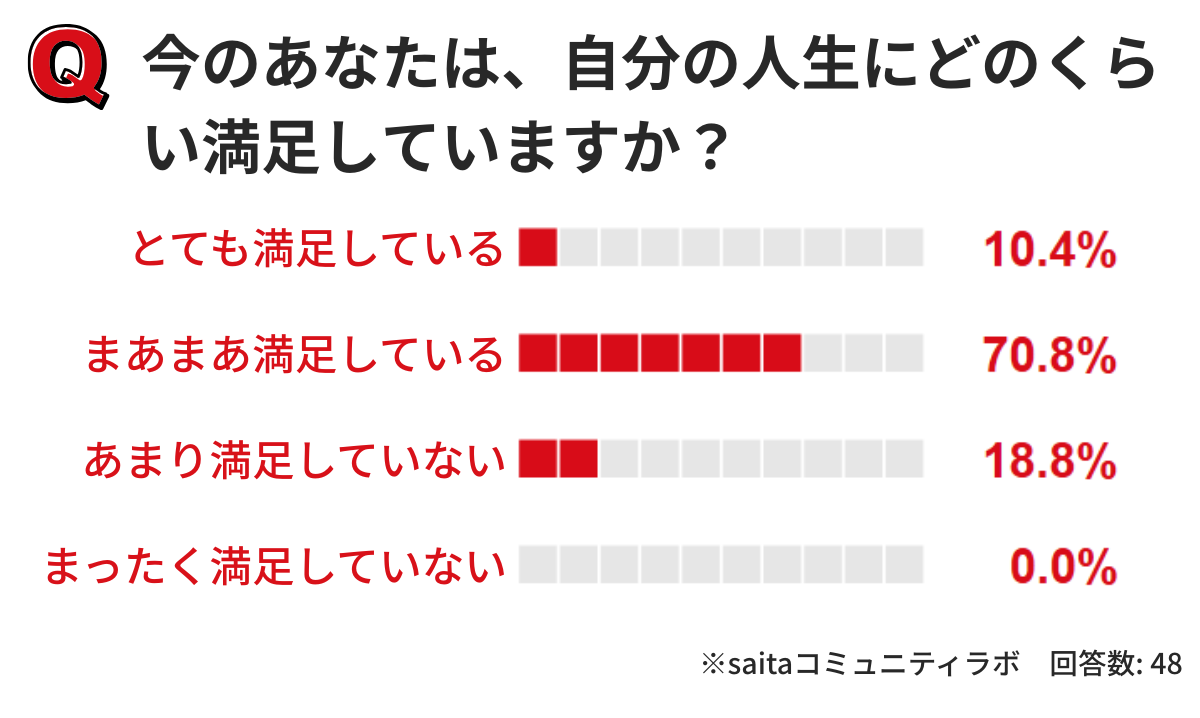 まず「自分の人生への満足度」について伺ったところ、最も多かった回答は「まあまあ満足している」(70.8%)でした。日々の中に小さな不安や不満、思い通りにいかないことはあっても、自分なりに折り合いをつけ、前向きに過ごしている人が多いようです。