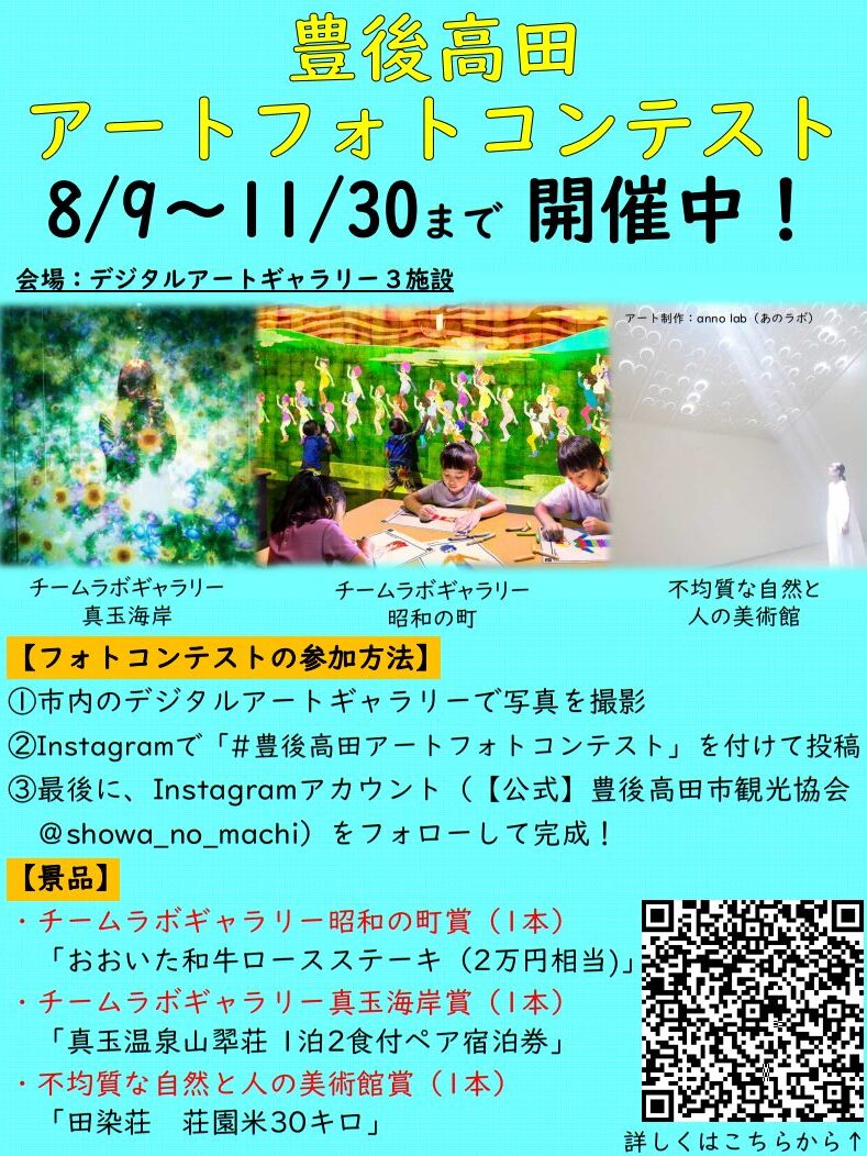 市内のデジタルアートギャラリー3施設を対象に、Instagramで作品を投稿して参加するフォトコンテストです。指定ハッシュタグ「#豊後高田アートフォトコンテスト」を付けて投稿すると、抽選で「ペア宿泊券」「荘園米30kg」「和牛ロースステーキ」など豪華賞品が当たります!