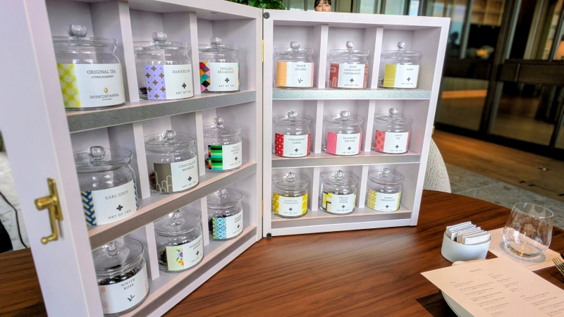 合わせるドリンクは、木箱に並んだ茶葉の実物を見ながら選べるシステム。ずらりと並ぶ紅茶やハーブティーなどの中から、スタッフさんにおすすめを聞いたり香りを試したりしながら選べます。インターコンチネンタル札幌オリジナルの紅茶「シトラスハーモニー」は柑橘の香りがさわやかで、スイーツにもセイボリーにも相性の良い紅茶でした。
