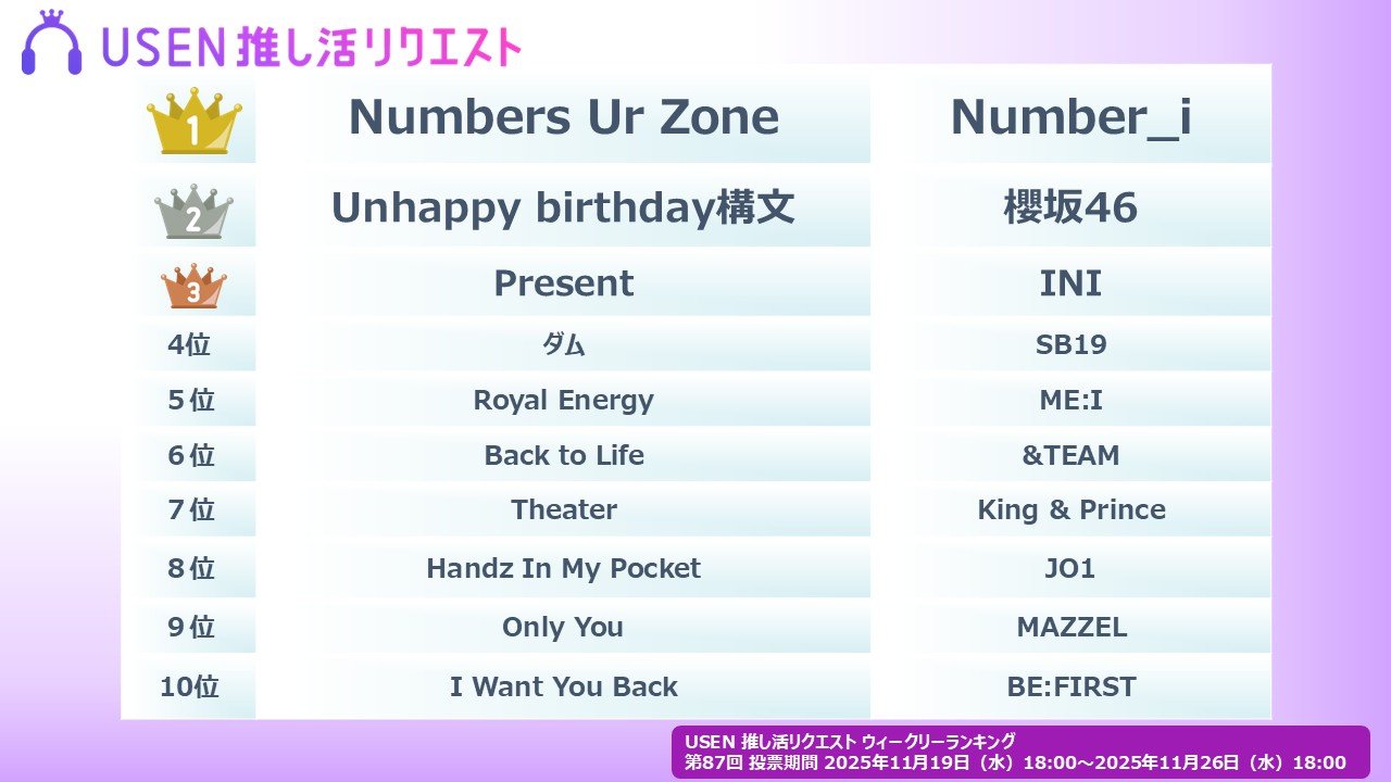 Number_iの「Numbers Ur Zone」が2週連続1位を獲得!USEN 推し活リクエスト(推しリク)第87回 「ウィークリーランキング」を発表!~ 上位ランクイン楽曲は街中・店内で配信!