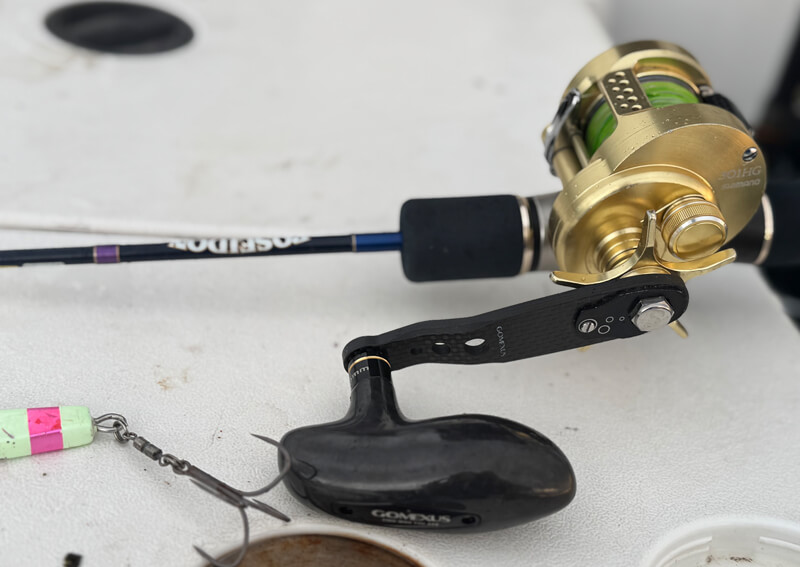 リールのリトリーブでジグへの入力を行う場合は、リールハンドルなどのカスタムが効果的ですキモは「しっかりと止める」こと!