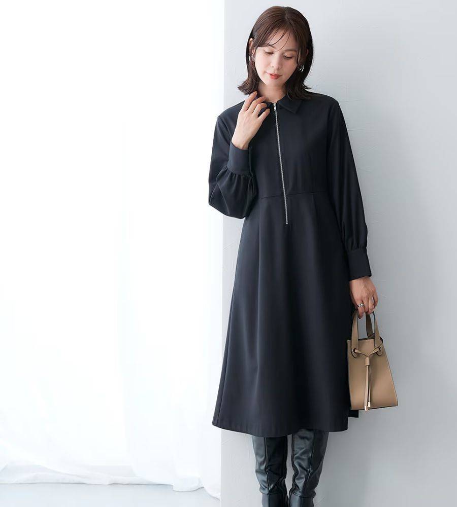 着痩せ効果!おすすめブラックアイテム①ニッセン 襟付きフロントジップタックワンピース