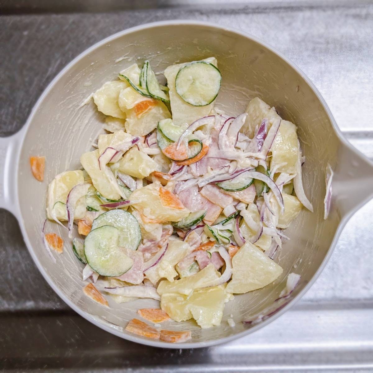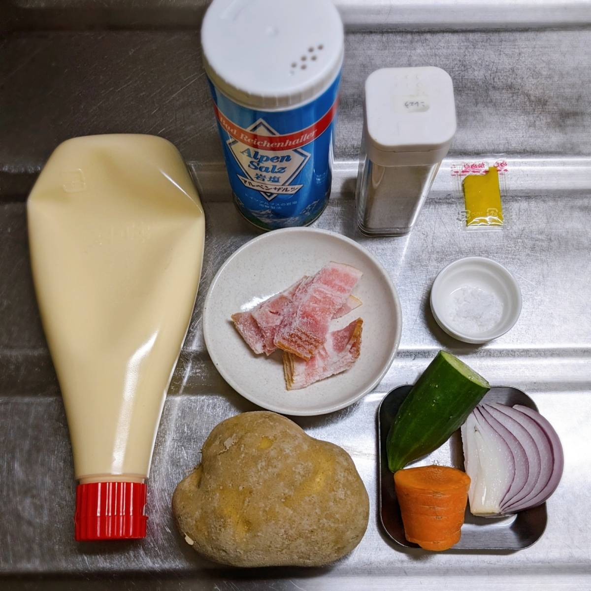 晩ごはんの一品に「ジャガ人参きゅうりのマヨ辛子ベーコンサラダ」を作ってみました♪ レシピ引用元:https://life.ja-group.jp/recipe/detail?id=3166