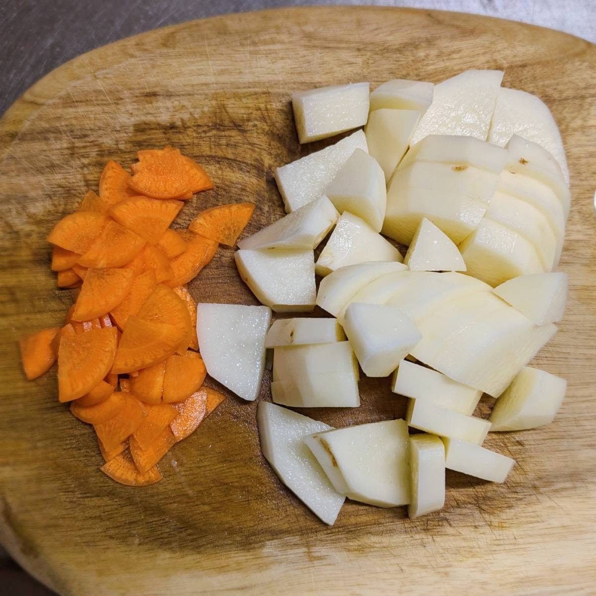 じゃがいもとにんじんは、食べやすい大きさに切ります。