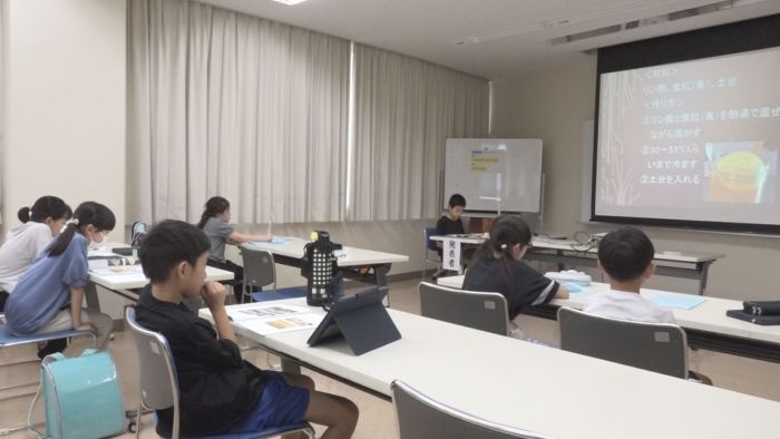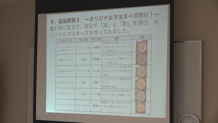 発表ではマヨネーズは卵の黄身の乳化作用で、油と酢がうまく混ざることが分かったと話しました。この結果をもとに、米油と黒酢や、オリーブオイルと穀物酢の組み合わせなどで、オリジナルのマヨネーズづくりに挑戦した感想も発表しました。