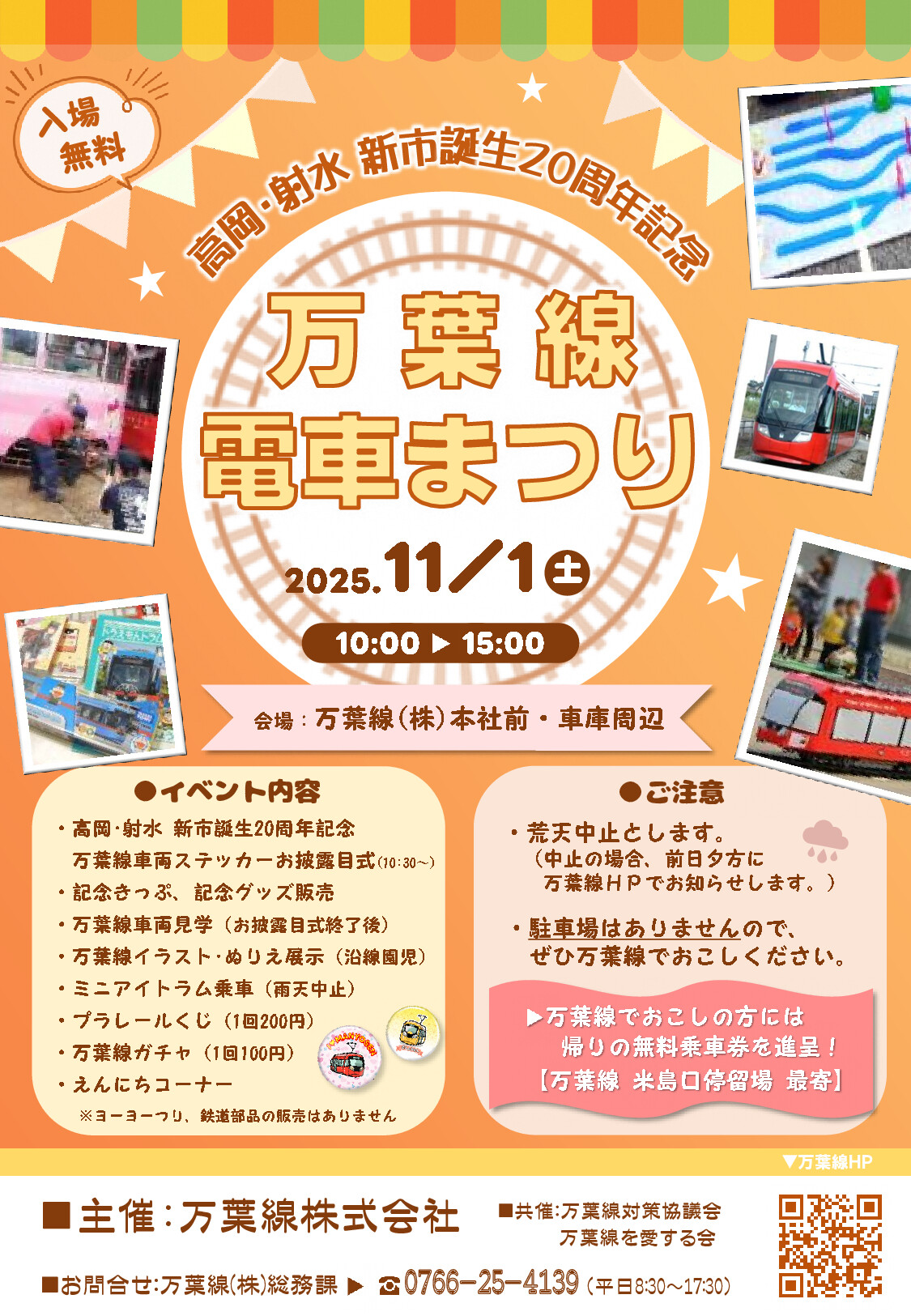 毎年秋に行われる「電車まつり」、2025年は高岡・射水 新市誕生20周年を記念した「万葉線車両ステッカー」のお披露目式を予定しているほか、記念きっぷやグッズの販売を予定。車両の見学やミニアイトラム乗車(雨天中止)、プラレールくじ、万葉線ガチャ、縁日なども楽しめます。