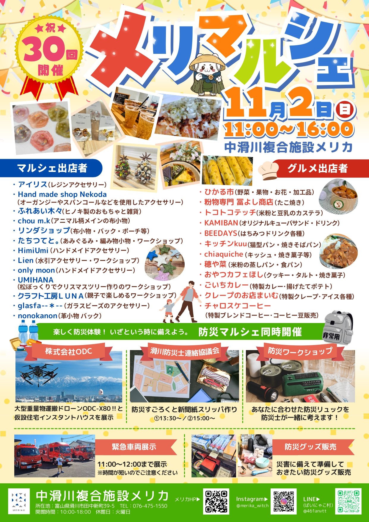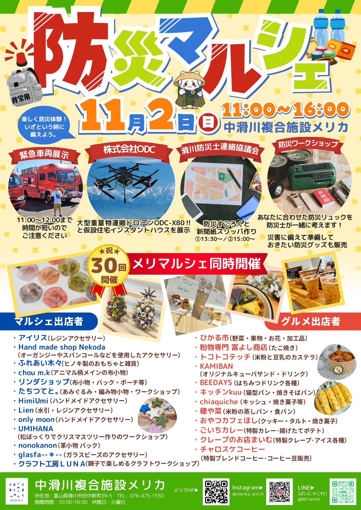 「楽しく防災体験」をポイントに開催する、防災マルシェ。防災すごろくや、新聞紙のスリッパ作り体験、防災リュックの中身を防災士が一緒になって考える「防災ワークショップ」、緊急車両の展示などを行います。毎月恒例イベント「メリマルシェ」も同時開催。グルメやアクセサリー、和小物などのお買い物も楽しめます。
