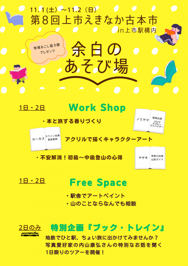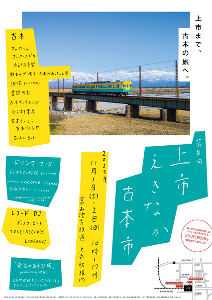 趣きある上市駅が活字であふれる2日間。絵本から専門書まで幅広い分野の古本に加え、フード、ドリンクの販売するほか、上市町の地域おこし協力隊によるセミナーやワークショップを楽しめます。