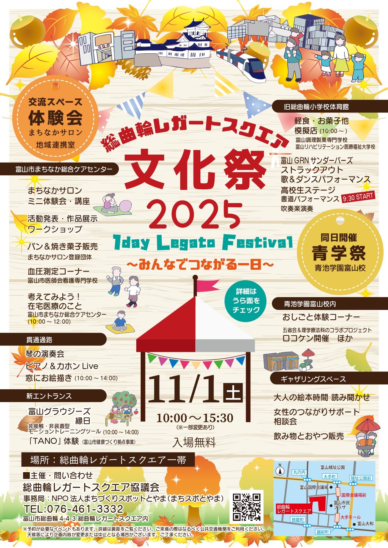 富山市の旧総曲輪小学校の跡地にある「総曲輪レガートスクエア」は、医療・福祉・健康をテーマとした官民連携の複合施設。秋恒例の文化祭では、富山グラジーズによる「縁日」、木工クラフトなどのワークショップ、子育てトーク、絵本の読み聞かせなどを楽しめるほか、青池学園の文化祭「青学祭」も同日開催。学生手作りの軽食やお菓子の販売、理学療法士や介護福祉士などの「おしごと体験」も。