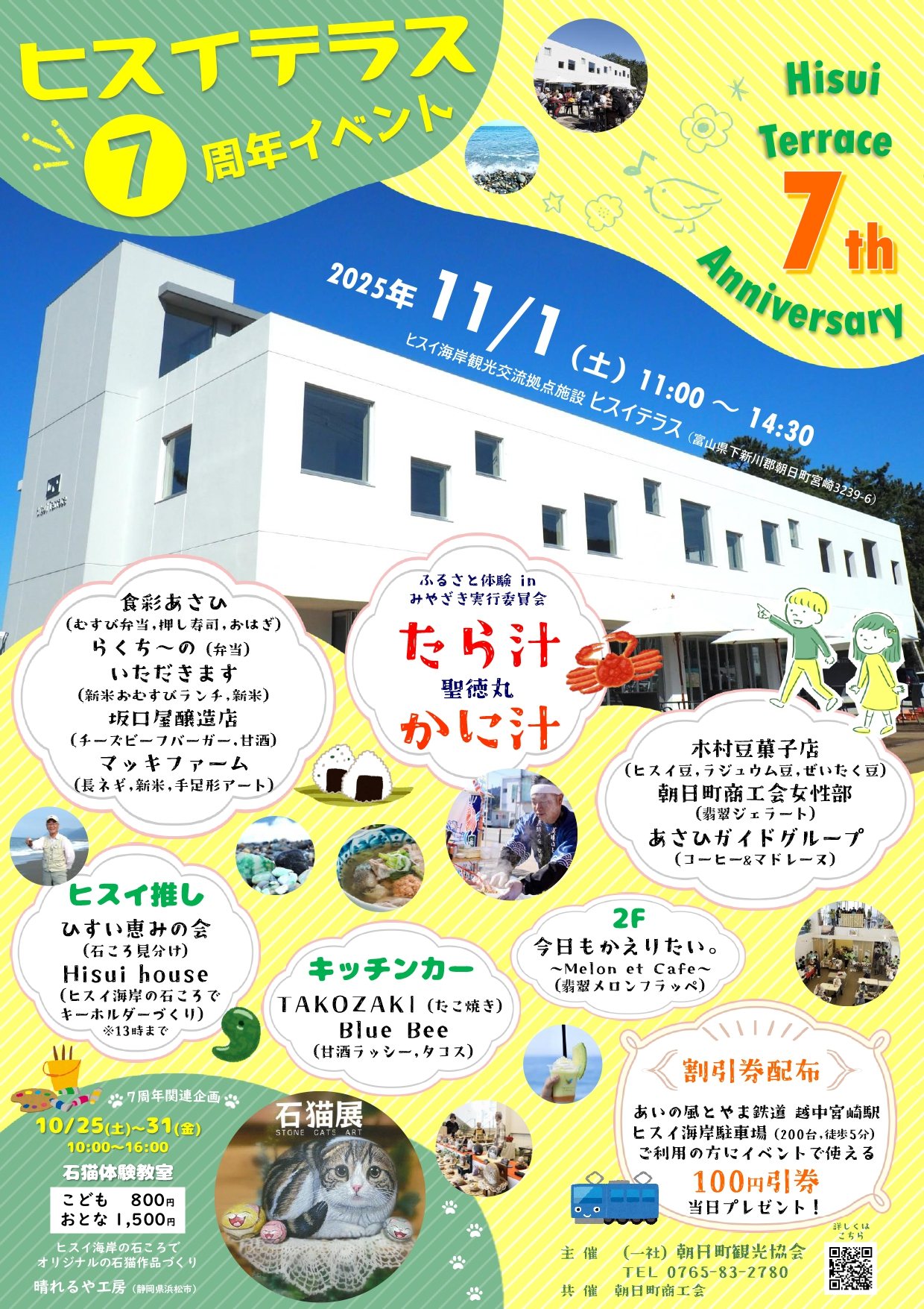 ヒスイテラスの7周年を記念して開催されるイベントです。「海辺のマルシェ」では漁師「聖徳丸」のかに汁やたら汁など、朝日町グルメが大集合。目の前に広がるヒスイ海岸で”ヒスイ”を見つけるポイントを教えてもらえたり、海岸で見つけた石でキーホルダーを作れたりする企画も予定されています。