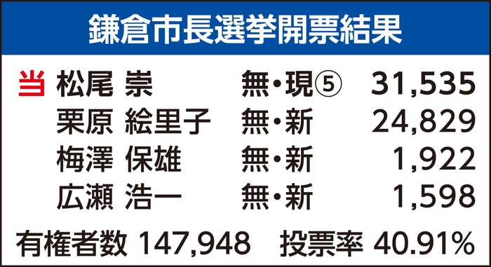 任期満了に伴う鎌倉市長選挙が10月26日に投開票され、現職の松尾崇氏(52・無所属)が5選を果たした。市庁舎移転やこれまでの松尾市政などが争点となった今回の選挙で松尾氏は3万1535票を獲得して新人3人を抑えた。鎌倉市長5期目は歴代最長。投票率は40・91%で過去2番目に低かった。