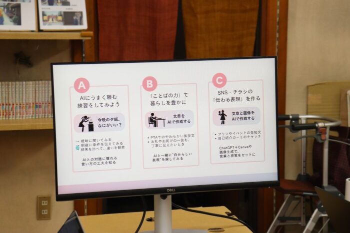 モニターには「A:AIにうまく頼む練習」「B:ことばの力で暮らしを豊かに」「C:SNS・チラシの伝わる表現を作る」と書かれたスライドが映し出され、参加者は自分の目的を設定して、いざスタートです。