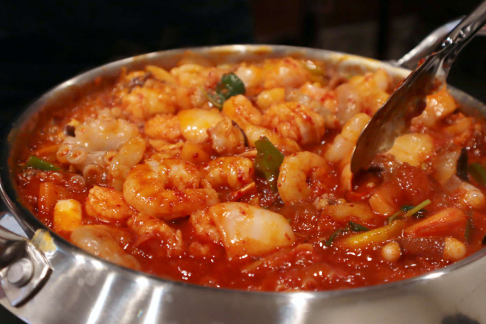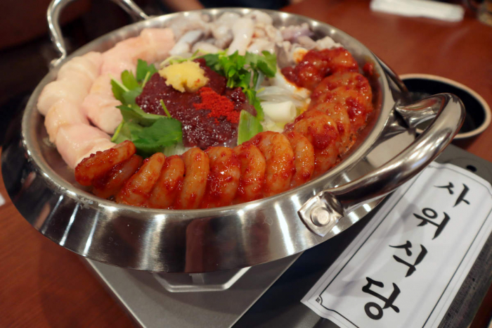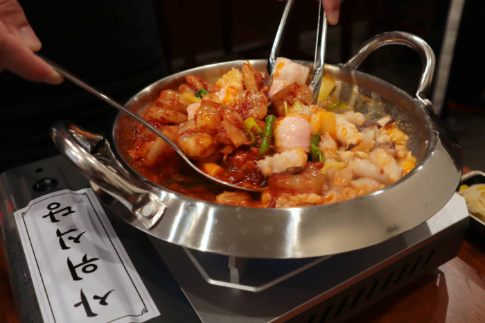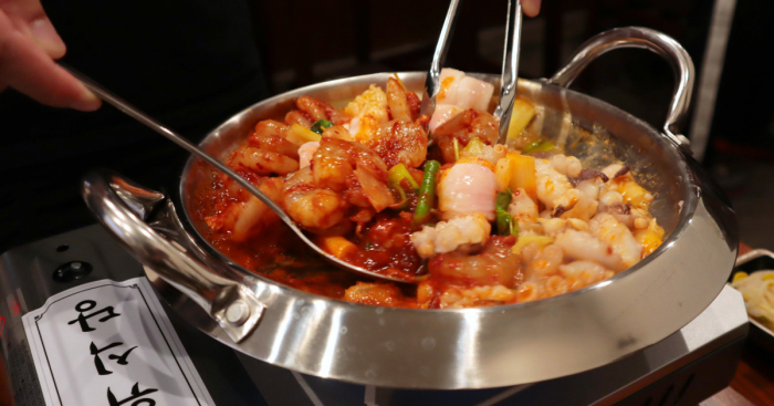 同店は釜山の郷土料理「ナッコプセ」の専門店。ナッコプセとはタコ、エビ、ホルモンに野菜や春雨を加え、ピリ辛タレと一緒に炒めて煮込んだもの。「タコ(ナクチ)」「ホルモン(コプチャン)」「エビ(セウ)」の頭文字がその名の由来となっています。