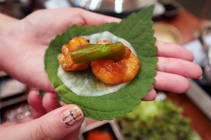 続いては大根やエゴマの葉で巻いたり、韓国のりや薬味をつけていただきます。さっぱりとした大根やエゴマの香りがよく合っておいしい!これらのおかずはお代わり自由となっているので、色々な食べ方を楽しむのもよさそうです♡