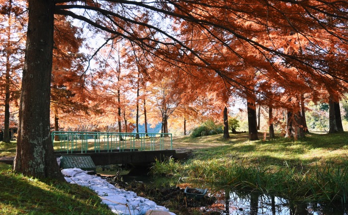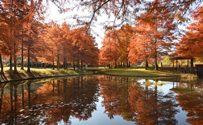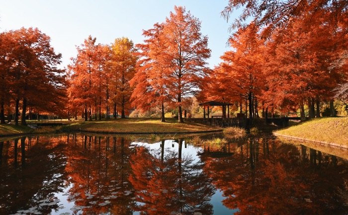 落羽松が朱色に染まる 三田市『小野公園』の“モネの池”から望む絵画のような絶景 三田市