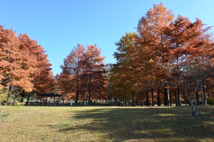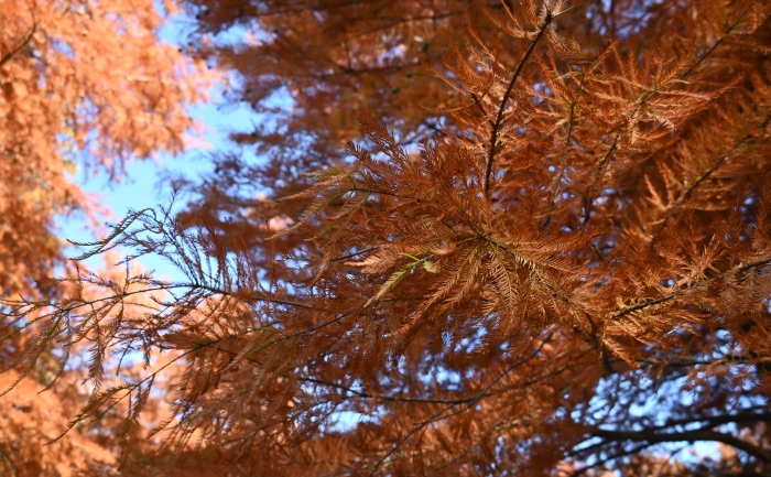 枝先まで深い朱色に色づいているのは、落羽松(ラクウショウ)の木。葉が羽のように落ちる様子から名付けられた名前だそうです。