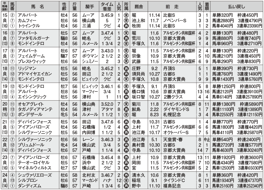 好走数トップはアルゼンチン共和国杯組で[3・2・3・28]。京都大賞典組が[2・3・2・9]で続くが、23、24年連勝と、勢いは断然こちらが上回る。