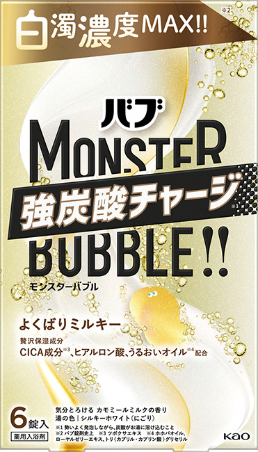 そしてもう一つ、「よくばりミルキー」が受け継ぐのが、モンスターバブルシリーズならではの炭酸の力だ。70gのBIG*5タブレットが勢いよく発泡し、湯に溶け込む炭酸濃度は従来品の約1.8倍。きめ細かな泡が全身を包み込み、きめ細やかな泡が全身を包み込み、湯上がりまでじんわりとした心地よさが続く。湯の表面にはバブ錠剤史上最大の白濁濃度が生み出すとろりとした乳白色の層が広がり、視覚的にも“贅沢な癒し”を感じられる。香りは「カモミールミルク」。やわらかな甘さの中に清らかさがあり、呼吸するたびに心がゆるむ。お湯のなめらかさと炭酸のきめ細やかな刺激が心地よく、まるでスパのジェットバスに浸かっているような満足感がある。入浴後はやさしい温もりにつつまれ、疲れがほぐれたような清涼感さえ覚える。
