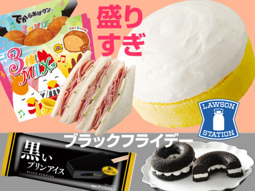 【コンビニ】新発売情報 〜11月17日(月)以降発売のローソン編。“待ってました!”あのおトクな大ヒット企画「盛りすぎチャレンジ」が2週にわたり再び開催!今回は第1週目発売の『Uchi Café盛りすぎ!プレミアムロールケーキ』や『でからあげクン 3種MIX味』などの全商品と、さらに「ブラックフライデー」仕様の『黒いプリンアイス』なども紹介。新作スイーツ中心にお送りします!