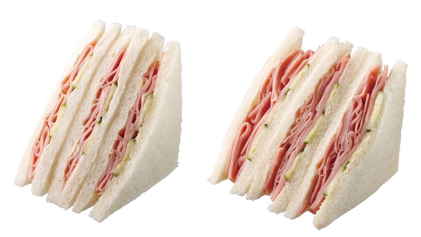 従来品「ハムサンド」と比較して、ハムの量を約50%増量。ジュ―シーなハムとからしマヨネーズソースを合わせ、ふんわり食感の食パンでサンドした仕立てです。(幅広っ!)