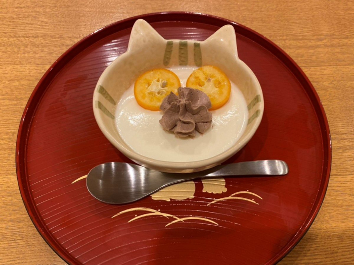 お店の前にある大きな猫のオブジェは、オーナーの愛猫をモチーフにしたキャラクターの「ムーちゃん」。ムーちゃんは愛猫ムースちゃんの愛称です。