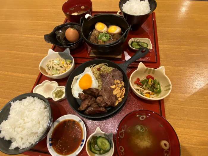 今回は定番メニューの「たまごかけご飯と国産黒毛和牛のすじ煮込み定食」と、人気急上昇中の「赤身とハラミの二種盛定食」をいただきました。