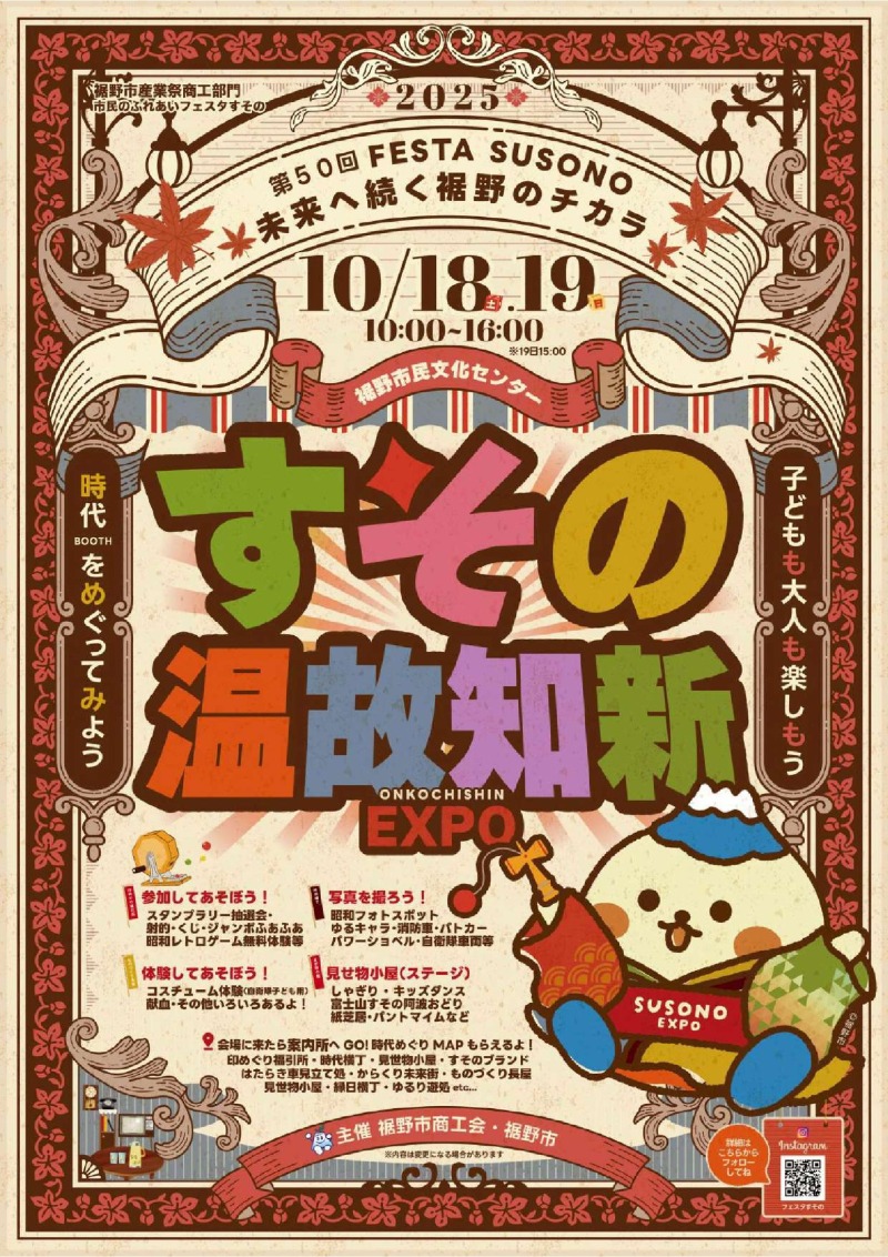 裾野市商工会による第50回の産業祭。「すその温故知新EXPO」をテーマに、飲食や特産品の販売、技術の展示が行われます。働く車の展示や、ステージイベント、スタンプラリー抽選会など、家族で楽しめる企画が満載です。