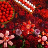 ピンク色のチョコレートフォンデュは、自分でフルーツをチョコレートにくぐらせて楽しめます。