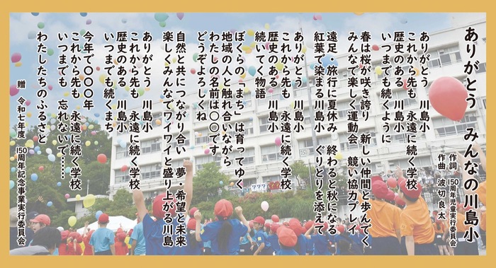 同校の創立150周年を祝い、次の世代にしっかりと受け継ぐことを目指し7月に同会が立ち上げたクラウドファンディングの目標金額は150万円。達成額に応じて、夏場の熱中症予防にもなる「冷水機」の購入や、校庭で日陰を作ることができる「藤棚」の設置などを計画している。10月30日時点で52人から48万1703円が集まっているという。現在は、150周年児童実行委員会が作詞をした「ありがとうみんなの川島小」がデザインされた「150周年記念ソングボード」の購入準備が進められており、記念式典で披露される予定だ。