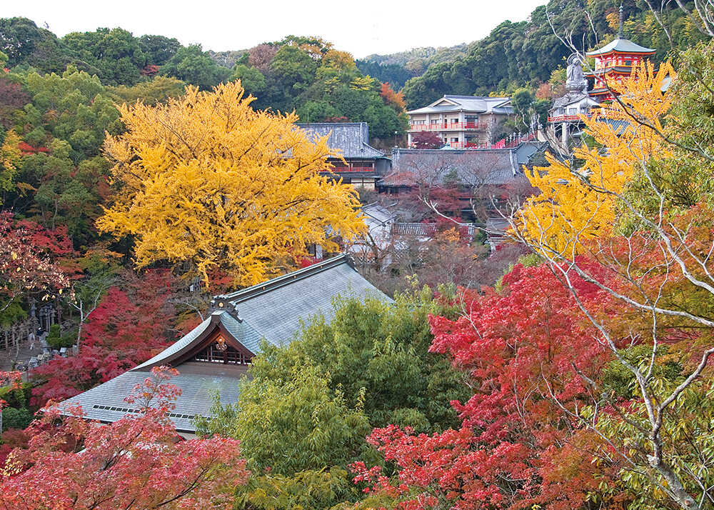 世界一大きな寅がお出迎え。樹齢500年の大イチョウをはじめ、全山が紅葉。本堂舞台から一望できる錦秋が見事。