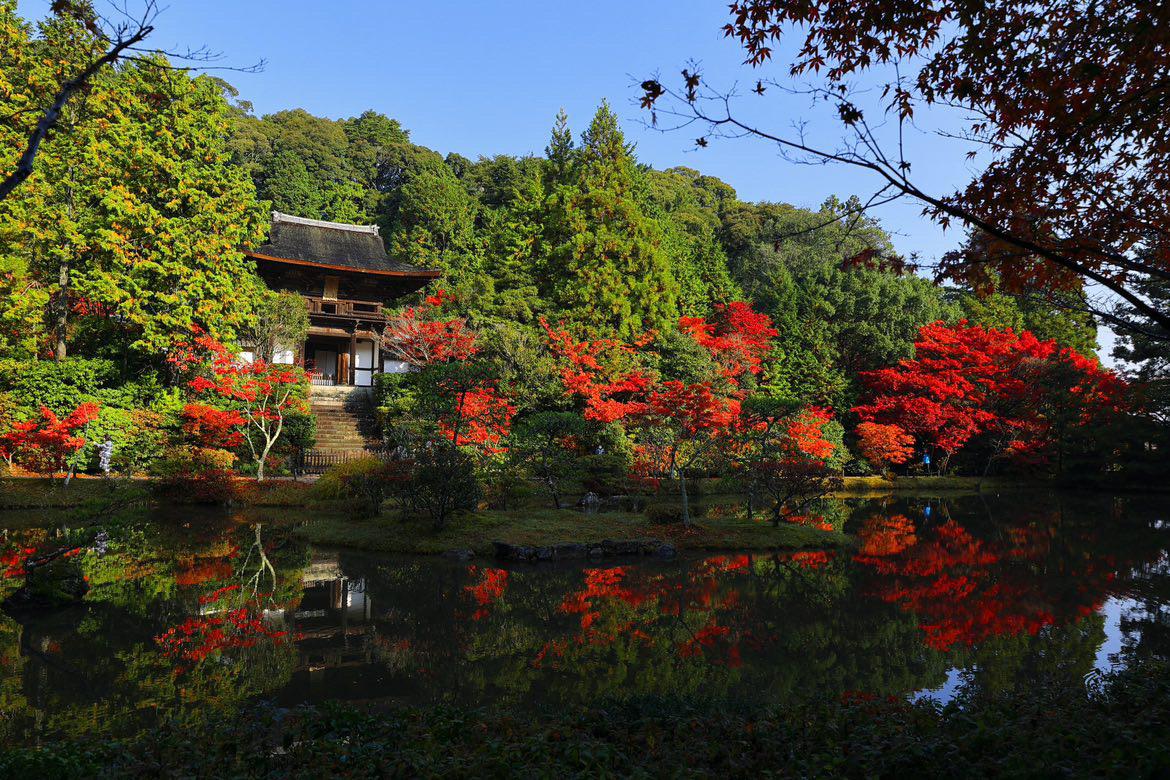 柳生街道沿いにある円成寺は平安時代創建の古刹。楼門前に広がる名勝庭園の木々が色づけば、池の水面に映りひときわ美しい景色に。伽藍から少し離れた東門付近も撮影スポットとして人気です!