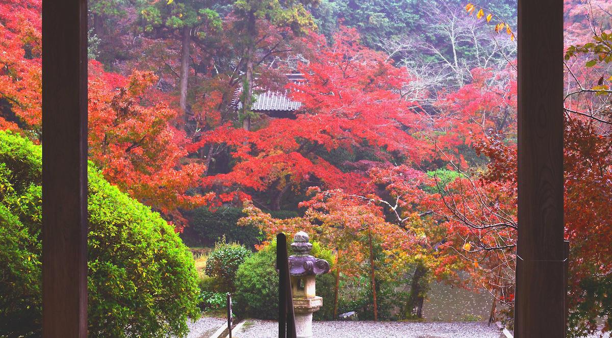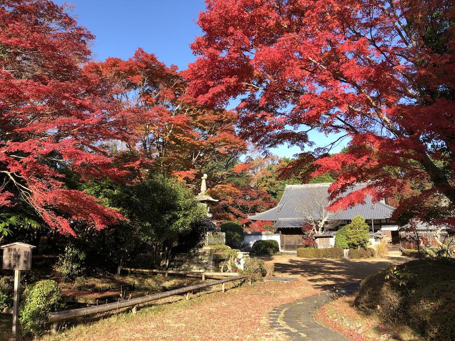 1638年、柳生藩主・柳生宗矩が父・柳生宗厳(石舟斎)の菩提を弔うために創建された禅寺。山門前や、山門から方丈へと向かう道を挟むように紅葉が赤く色づき、方丈からは塀の外の紅葉を借景にした庭園を見ることもできます。