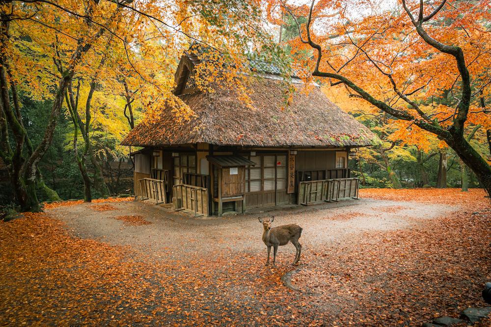 大正期築のかやぶき屋根の建物が森の中にぽつんとたたずむ光景に外国人観光客も多く訪れるスポット。茶屋周辺にはイロハモミジなどが分布し、屋根や地面に葉が落ちる頃には早朝から多くのカメラマンが撮影に訪れています。運が良ければ鹿との写真も撮れるかも…?