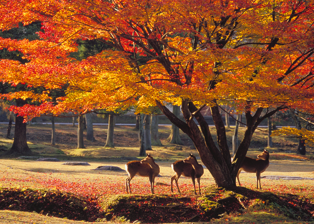 東大寺、興福寺、春日大社などの世界遺産があり、東西4㎞、南北2㎞に及ぶ広大な公園では、多種類の紅葉が初冬まで楽しめます。イチョウの絨毯もステキ!