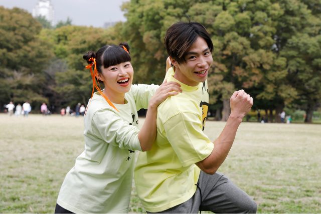 一度は体験したことがある基本の準備運動も、憧れの人と一緒にするのはやっぱり特別。梶原さんに「声出そう!」と言われて、元気な声が公園に響きます。