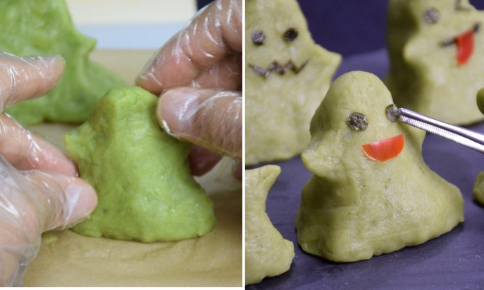 (7)好きなハロウィンキャラクターの形に整えて、海苔などを使って目、鼻、口を飾り付けたら完成。
