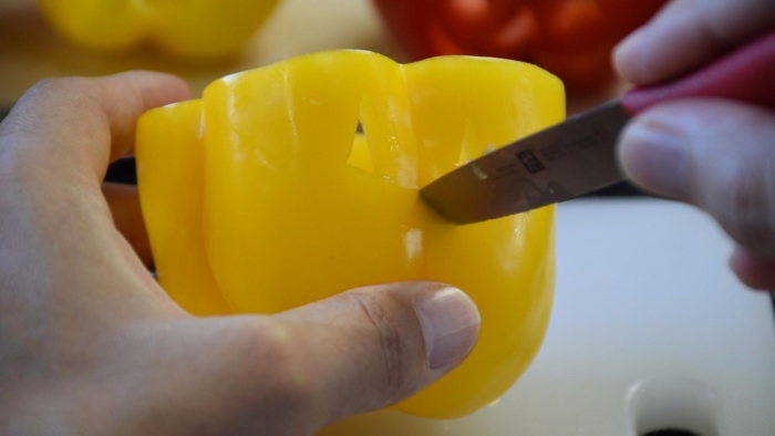 (2)パプリカのヘタを切り落とし(捨てずに取っておく)、ペティナイフでジャック・オー・ランタンの目、鼻、口の形に切り取る。たまねぎをあらみじん切りにする。