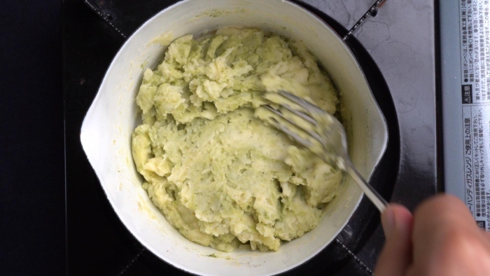 (4)牛乳を数回に分けて入れる。入れるたびにいもとよく混ぜる。