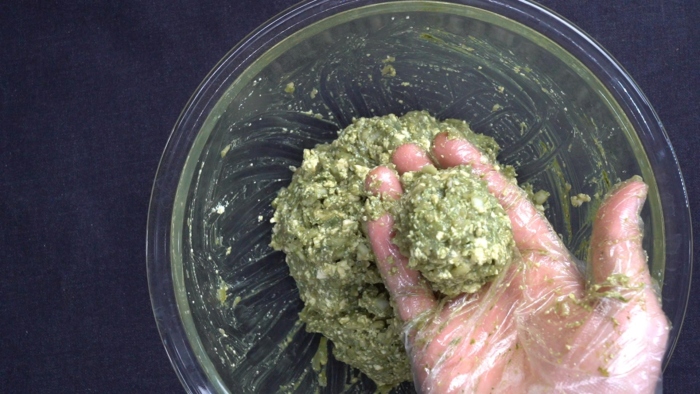 (4)(3)にあらびき茶をふるい入れ、しっかりとこねる。