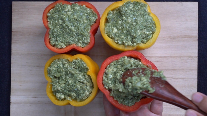 (5)(3)の肉だねを容器に入れ、ヘラなどで4等分にしたら、パプリカに詰める。