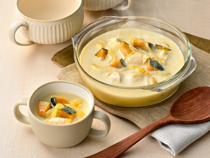 「マギー コンソメ」×かぼちゃ!「レンチン♪かぼちゃと鶏肉のクリーミースープ」